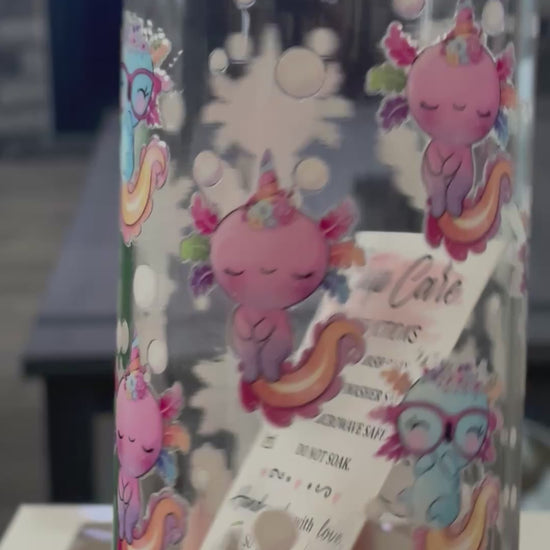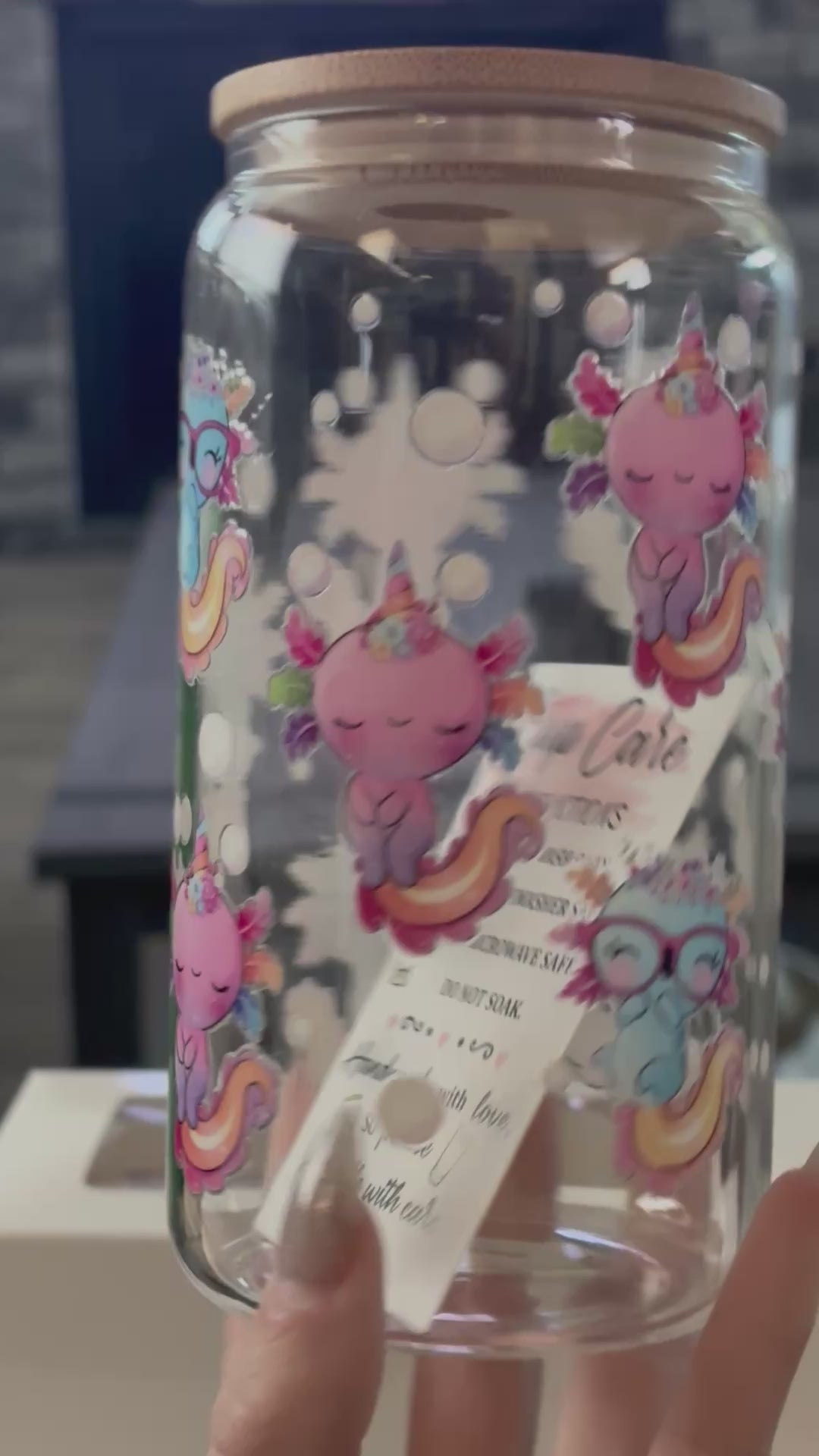 This 16 Oz glass cup measures 5.9 inches, perfect for any beverage hot or cold. It comes with a bamboo lid and a 7.6-inch glass straw.