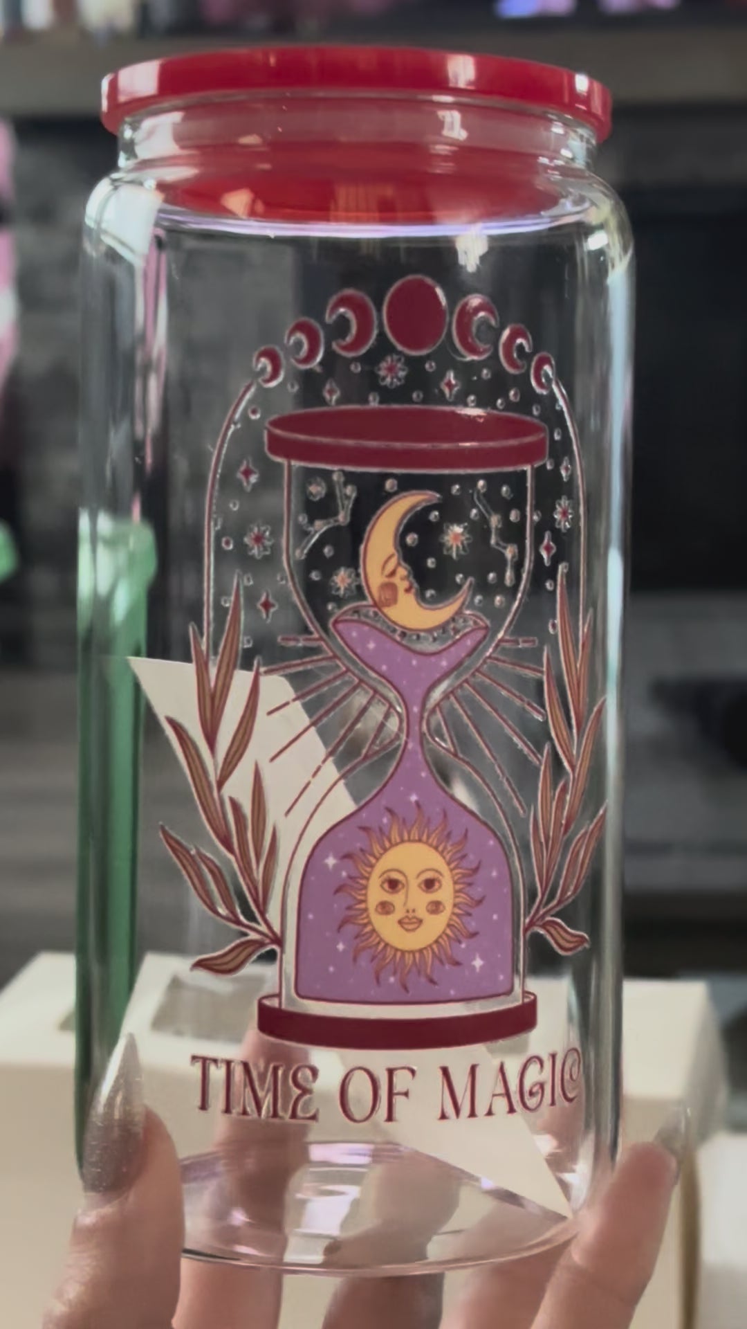 This 16 Oz glass cup measures 5.9 inches, perfect for any beverage hot or cold. It comes with an acrylic lid and a 7.6-inch glass straw.