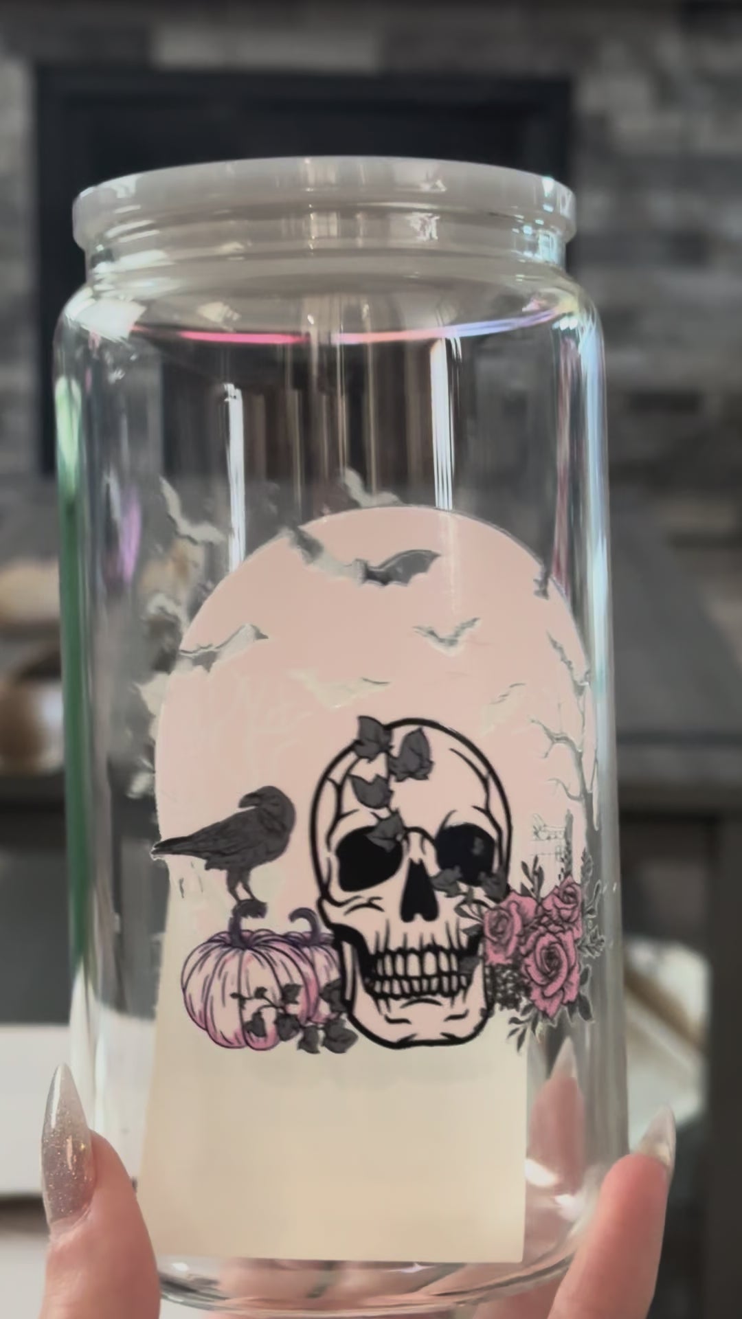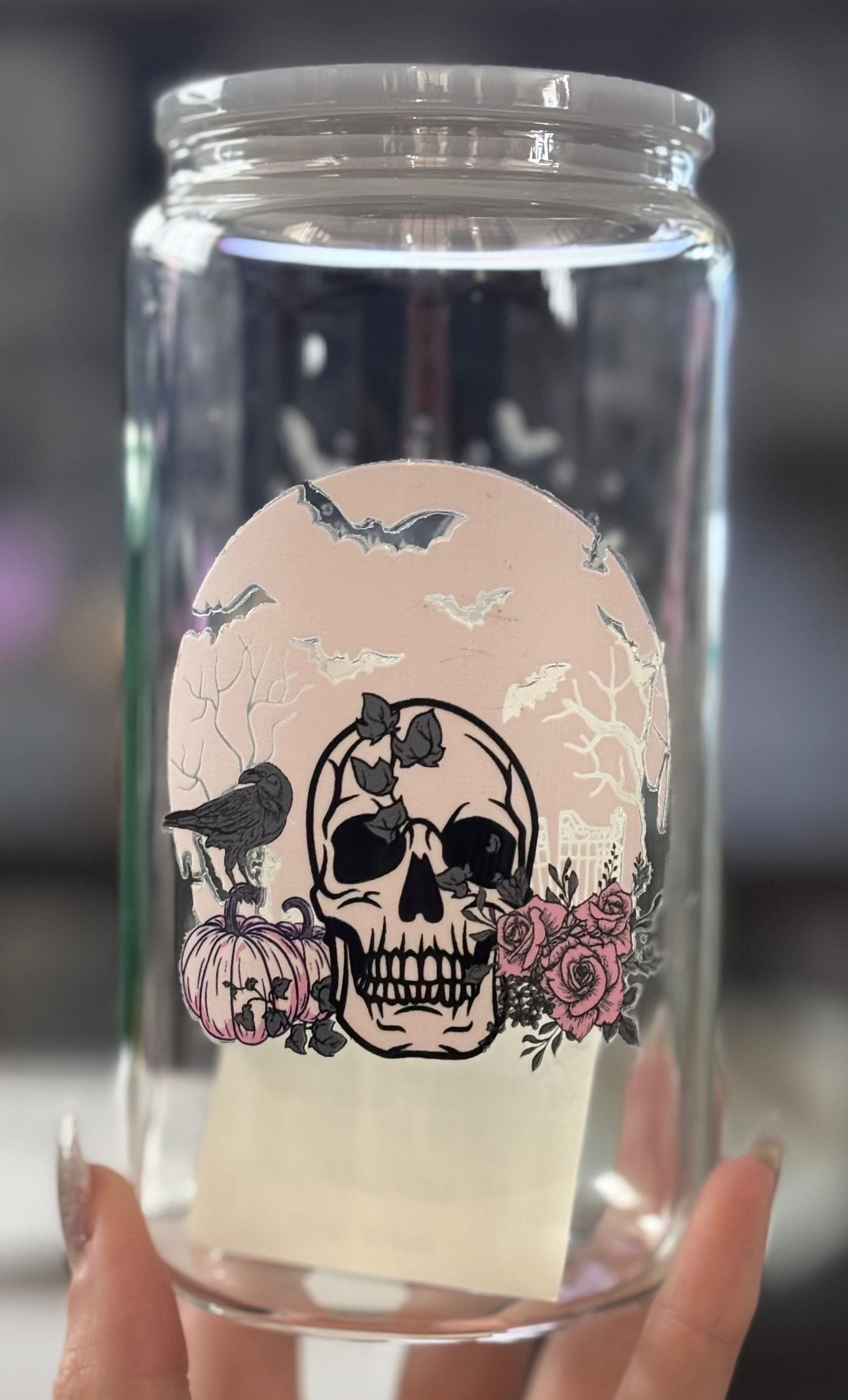 This 16 Oz glass cup measures 5.9 inches, perfect for any beverage hot or cold. It comes with a gray acrylic lid and a 7.6-inch glass straw.