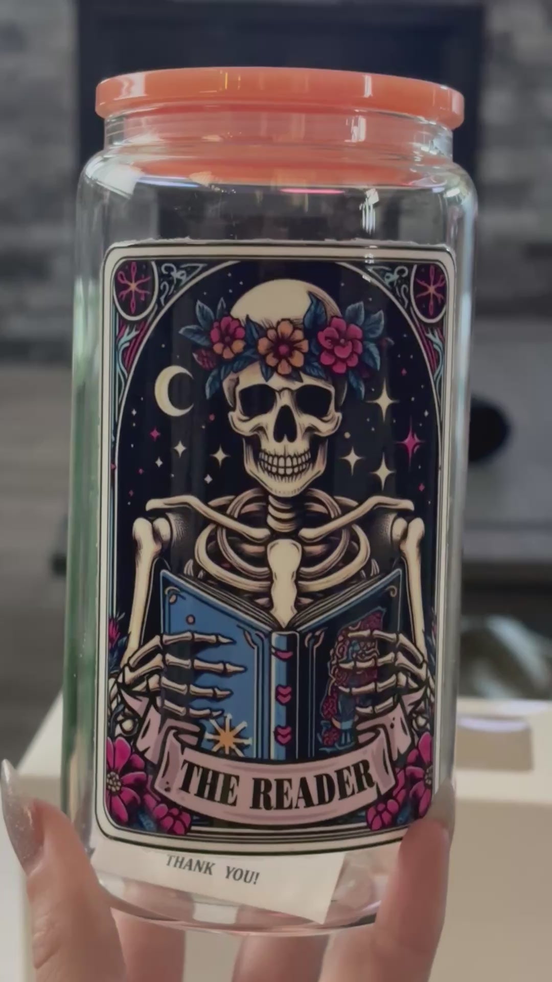 This 16 Oz glass cup measures 5.9 inches, perfect for any beverage hot or cold. It comes with an acrylic lid and a 7.6-inch glass straw.