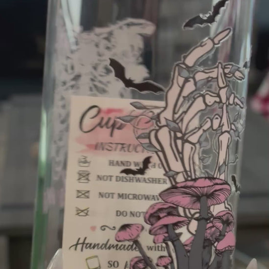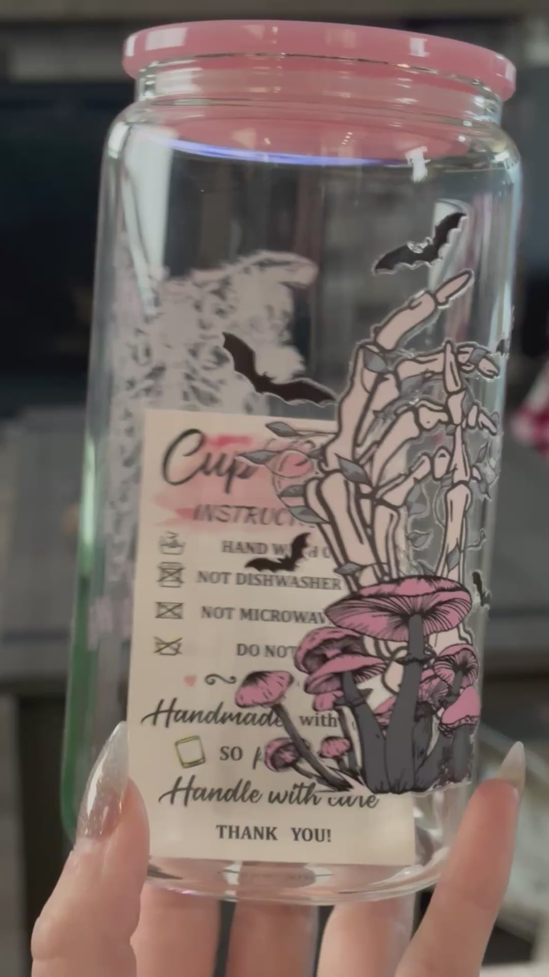 This 16 Oz glass cup measures 5.9 inches, perfect for any beverage hot or cold. It comes with a light pink acrylic lid and a 7.6-inch glass straw.