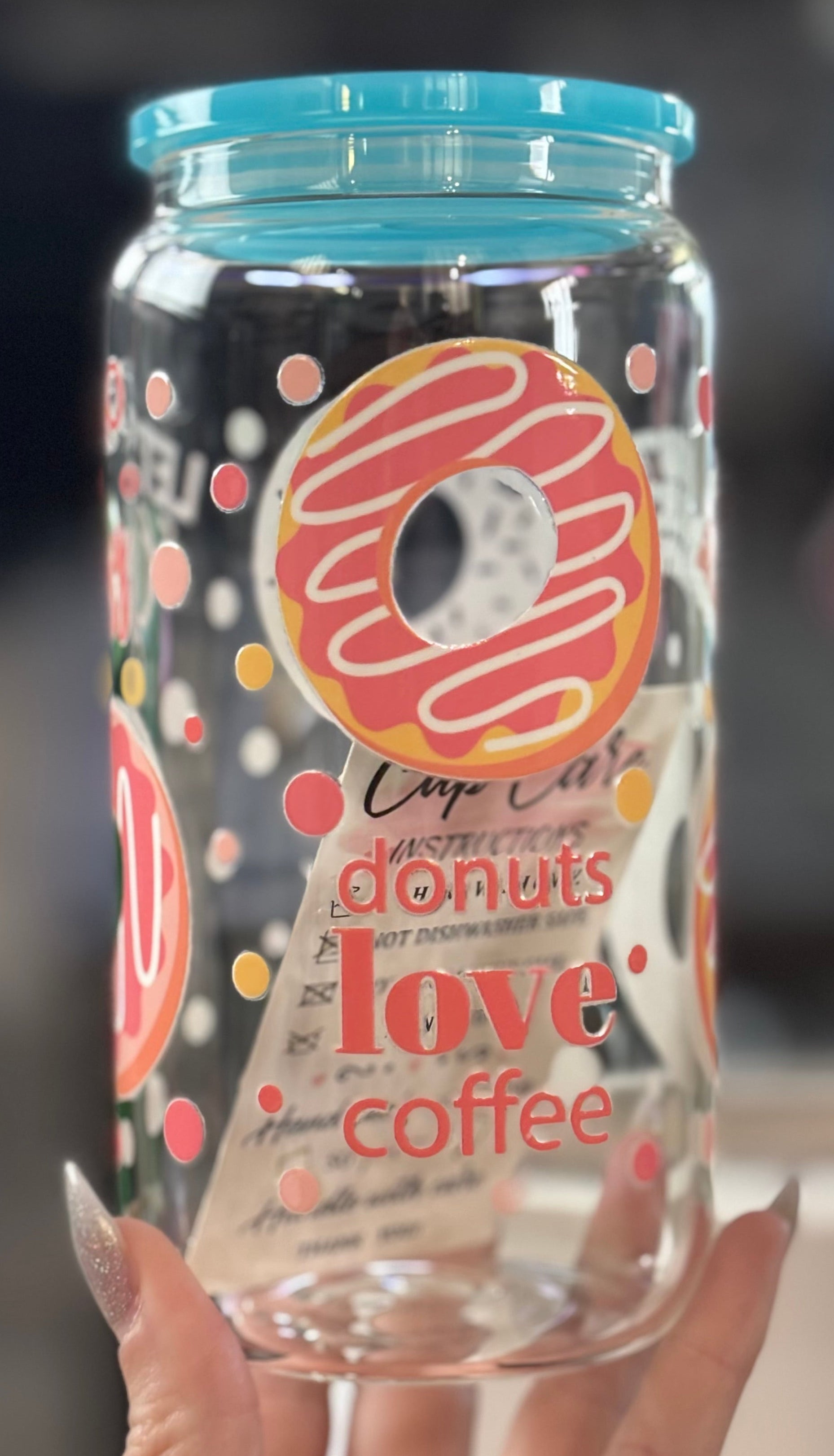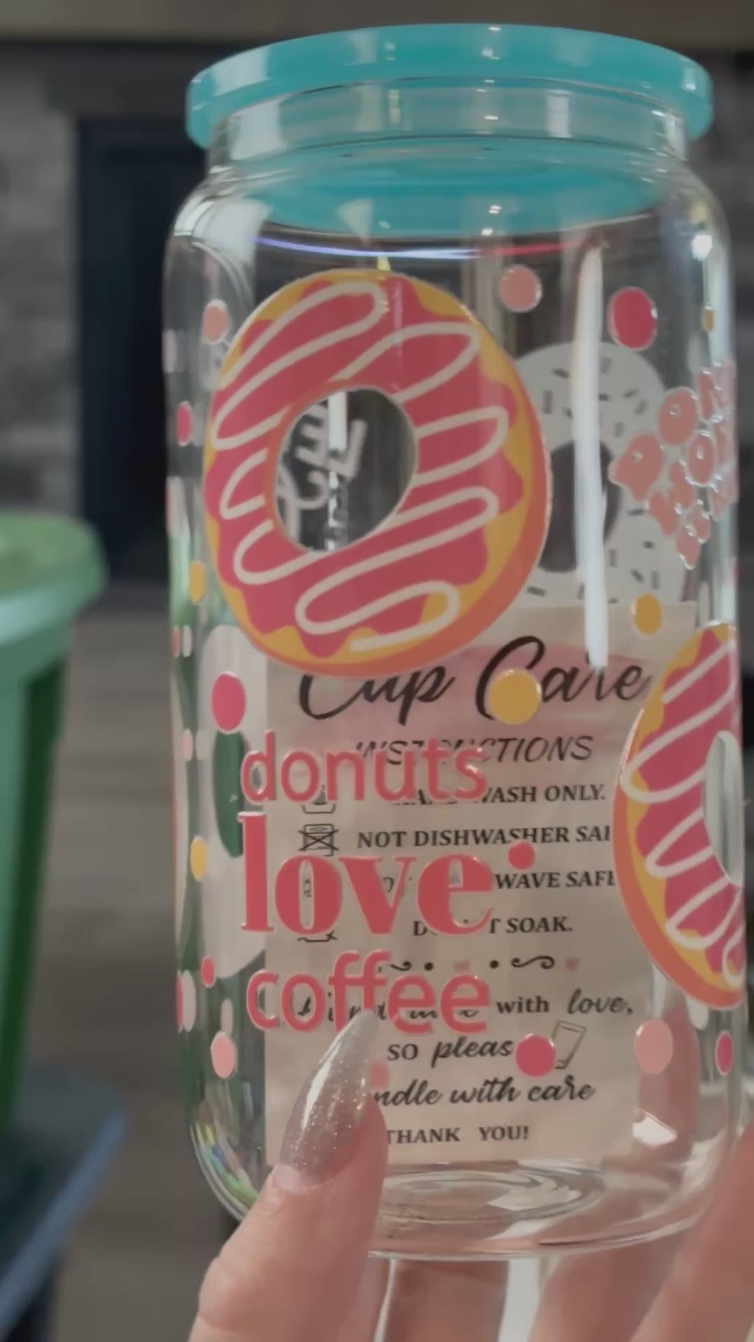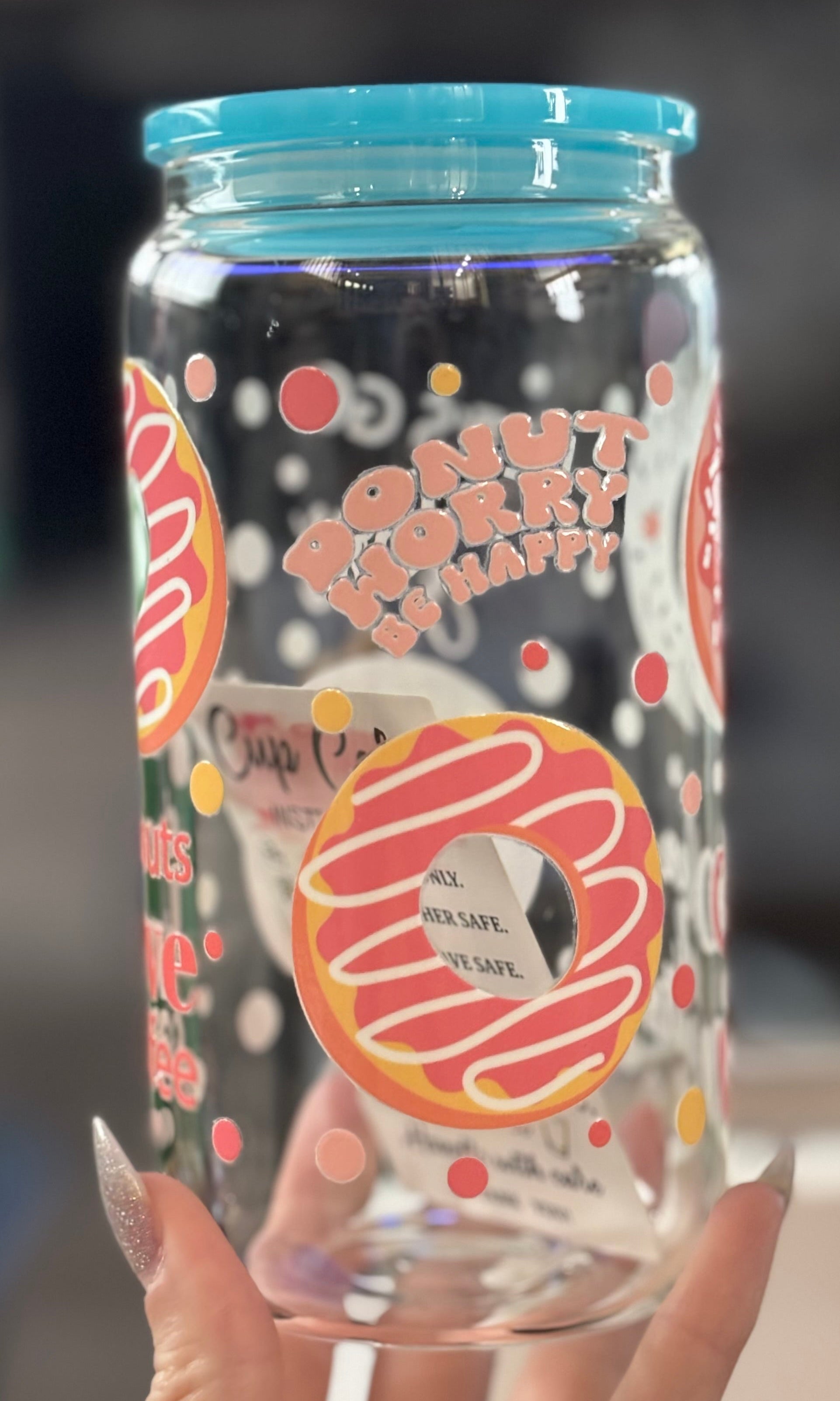 This 16 Oz glass cup measures 5.9 inches, perfect for any beverage hot or cold. It comes with a light blue acrylic lid and a 7.6-inch glass straw.